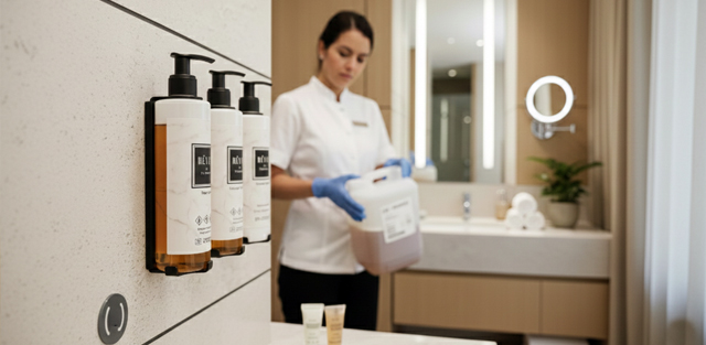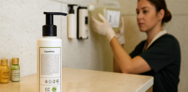 Cette transition accélère une recomposition déjà amorcée : des solutions alternatives émergent, entre distributeurs à poches hermétiques pré-remplies en usine et flacons de grande capacité que l’hôtel remplit lui-même à partir de bidons. Cette dernière option, séduisante par sa simplicité apparente, se trouve pourtant au cœur d’un paradoxe : en croyant adopter une pratique écologique, nombre d’hôteliers s’éloignent des exigences d’hygiène, de traçabilité et de conformité imposées par la réglementation cosmétique européenne.