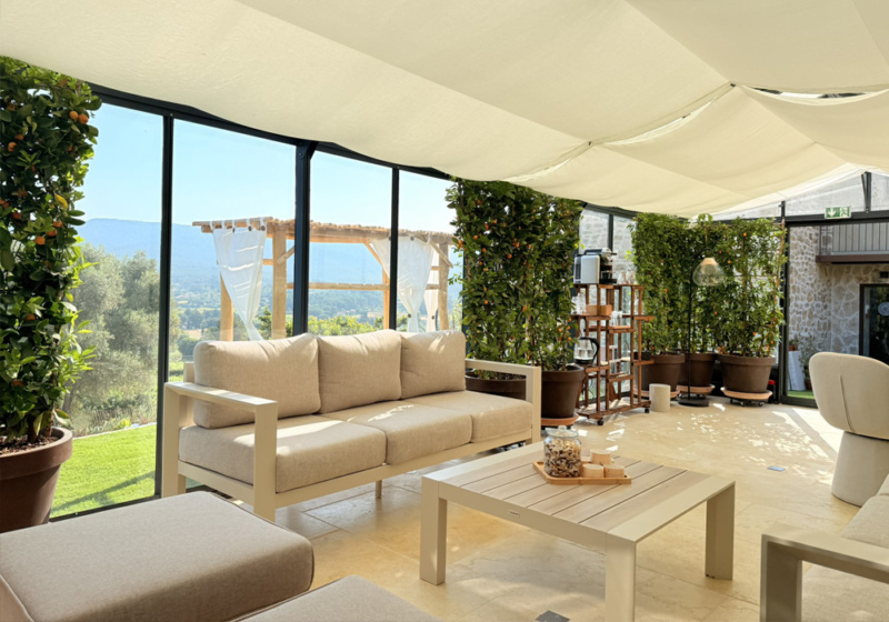 À l’extérieur, la nature prend soin : les Serres et les pergolas ombragées, la brise du mistral et la vue panoramique créent une atmosphère apaisante. À l’intérieur, les murs en pierre de la Bastide enveloppent le visiteur dans une bulle de sérénité.